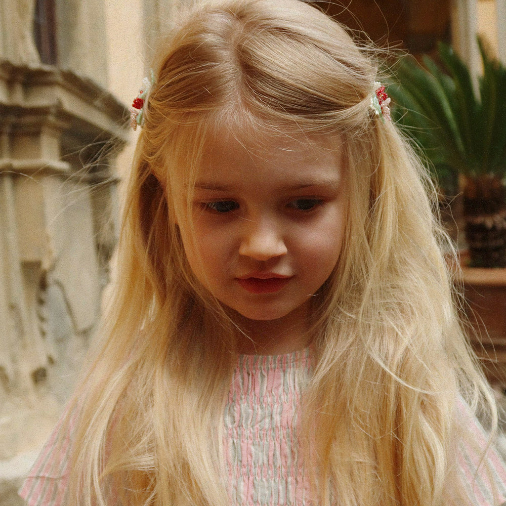 Hübsches Haarspangen-Set von Konges Sløjd bestehend aus 2 Haarklammern mit Blumenmotiven, verziert mit handgenähten Glasperlen. Ein niedliches Accessoire mit viel Charme und Liebe zum Detail.