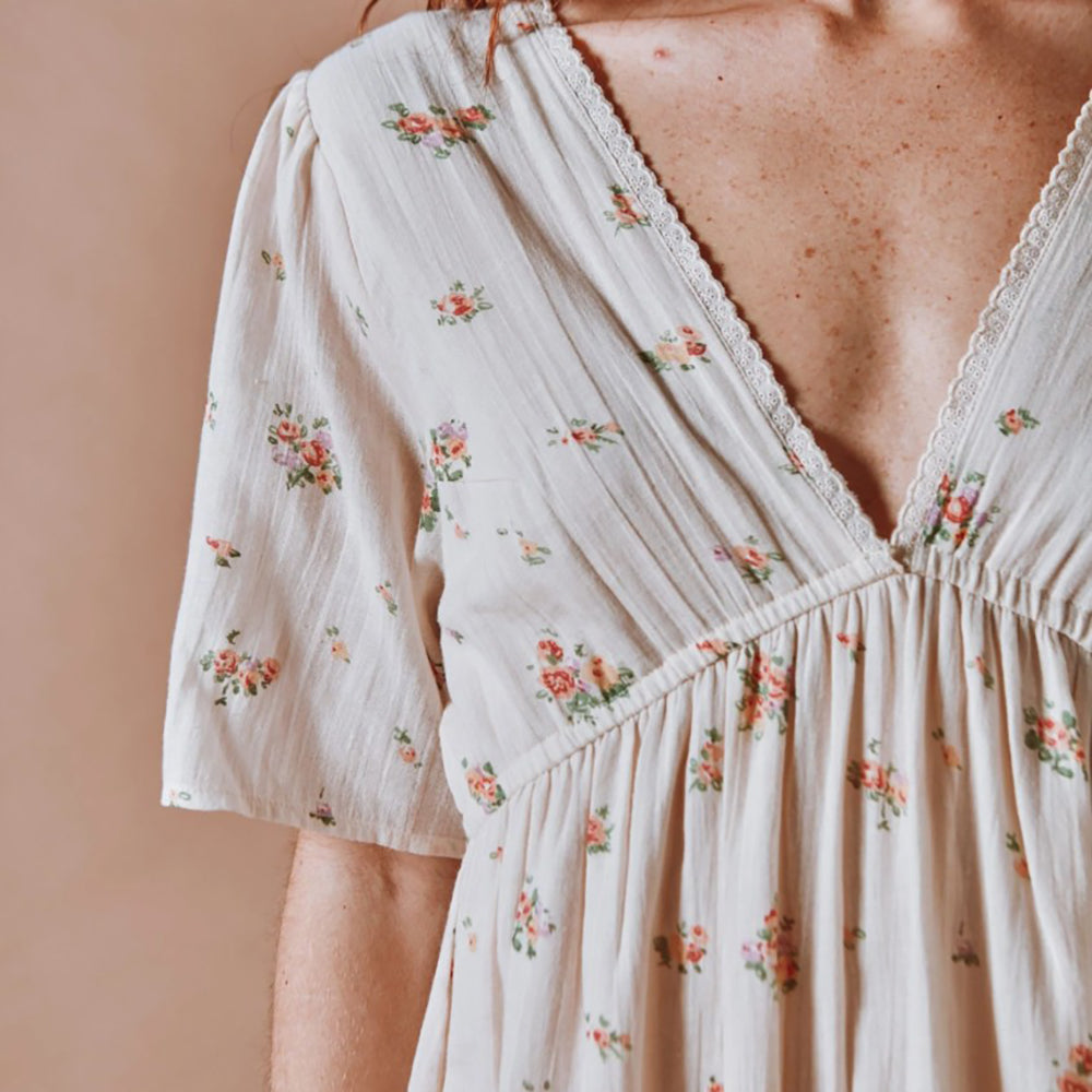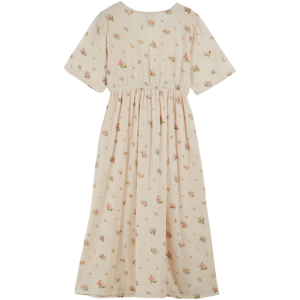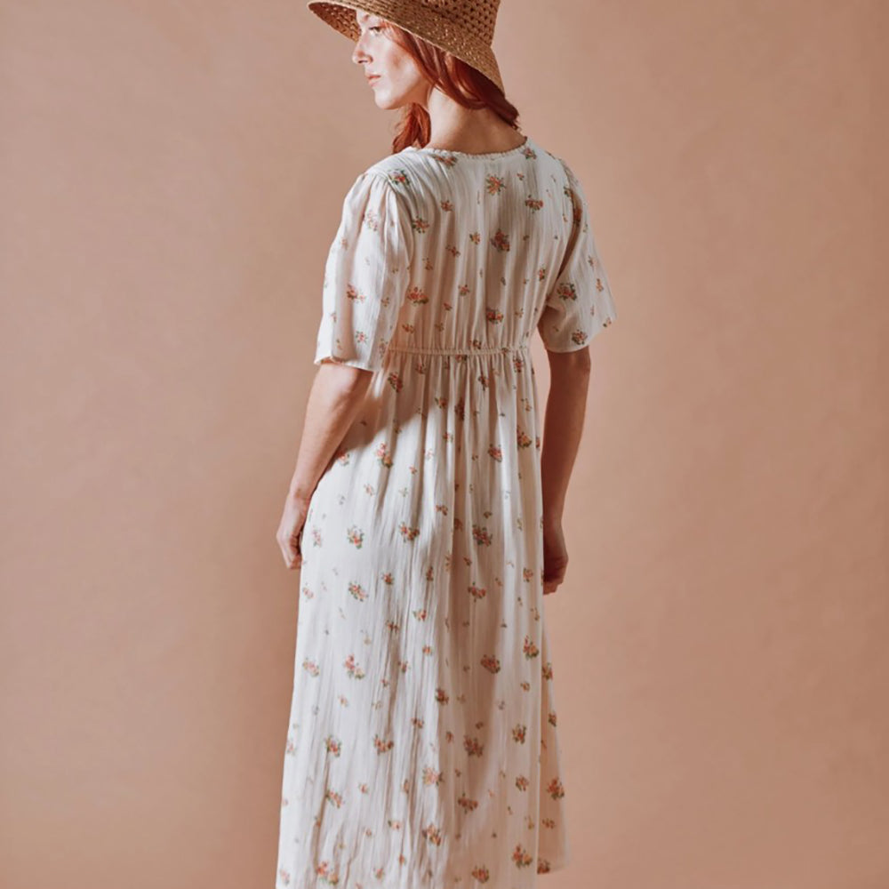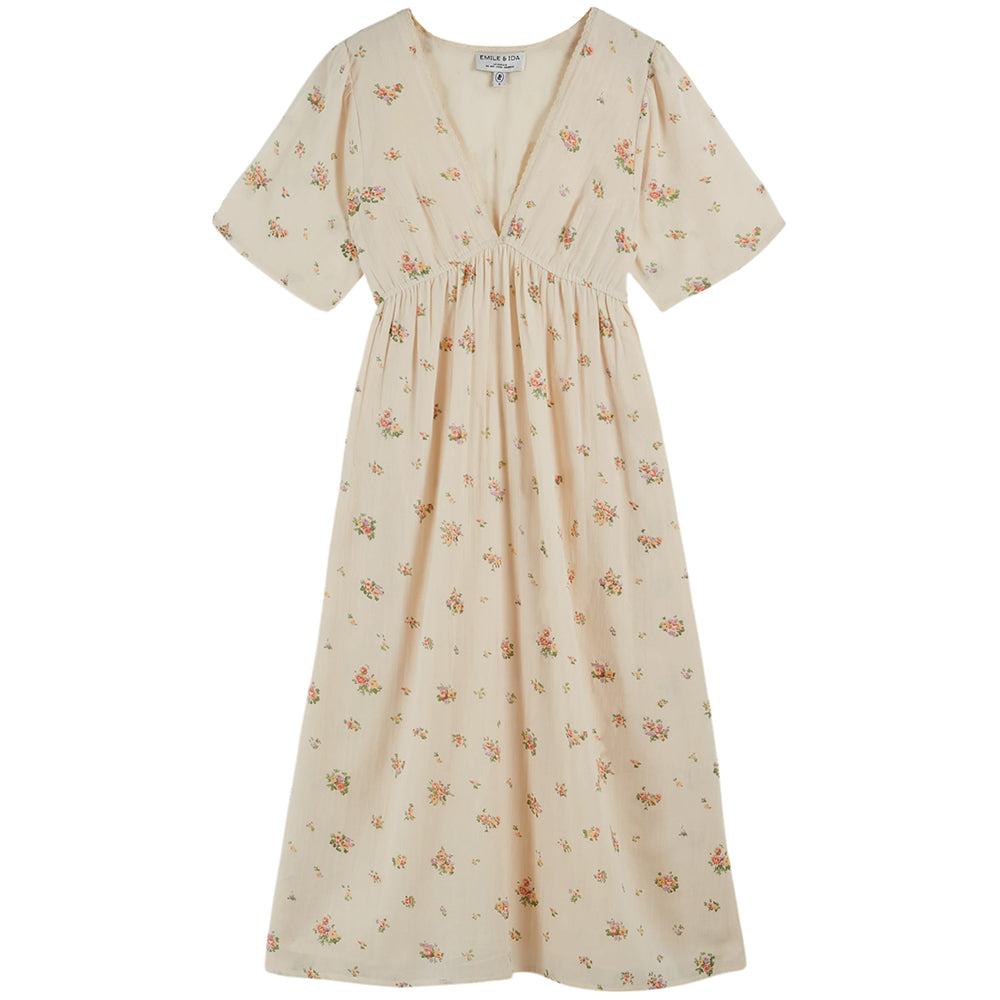 Langes Kleid von Emile & Ida aus ecrufarbenem Bio-Baumwollvoile, verziert mit unzähligen bunten Blumen. Der geraffte Rock sitzt an einem elastischen Bund, der sich sanft zwischen Brust und Taille hebt und diese betont.