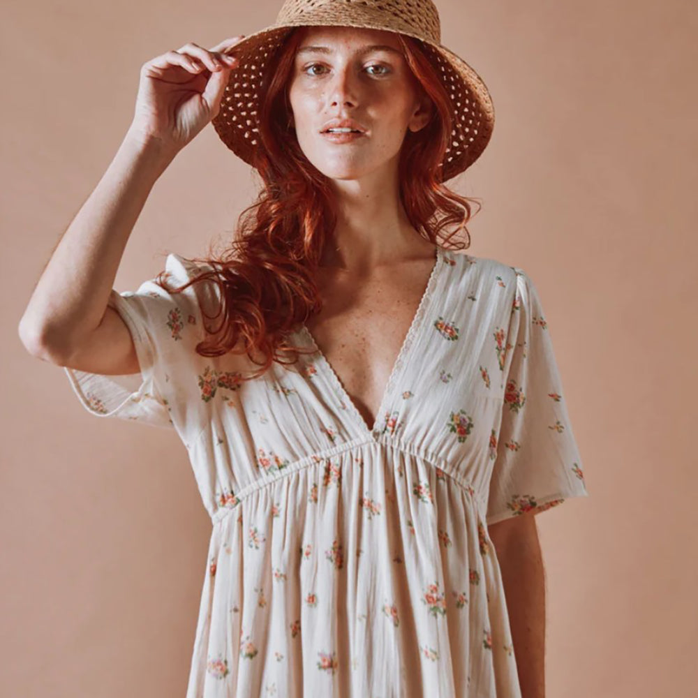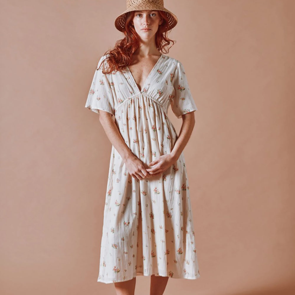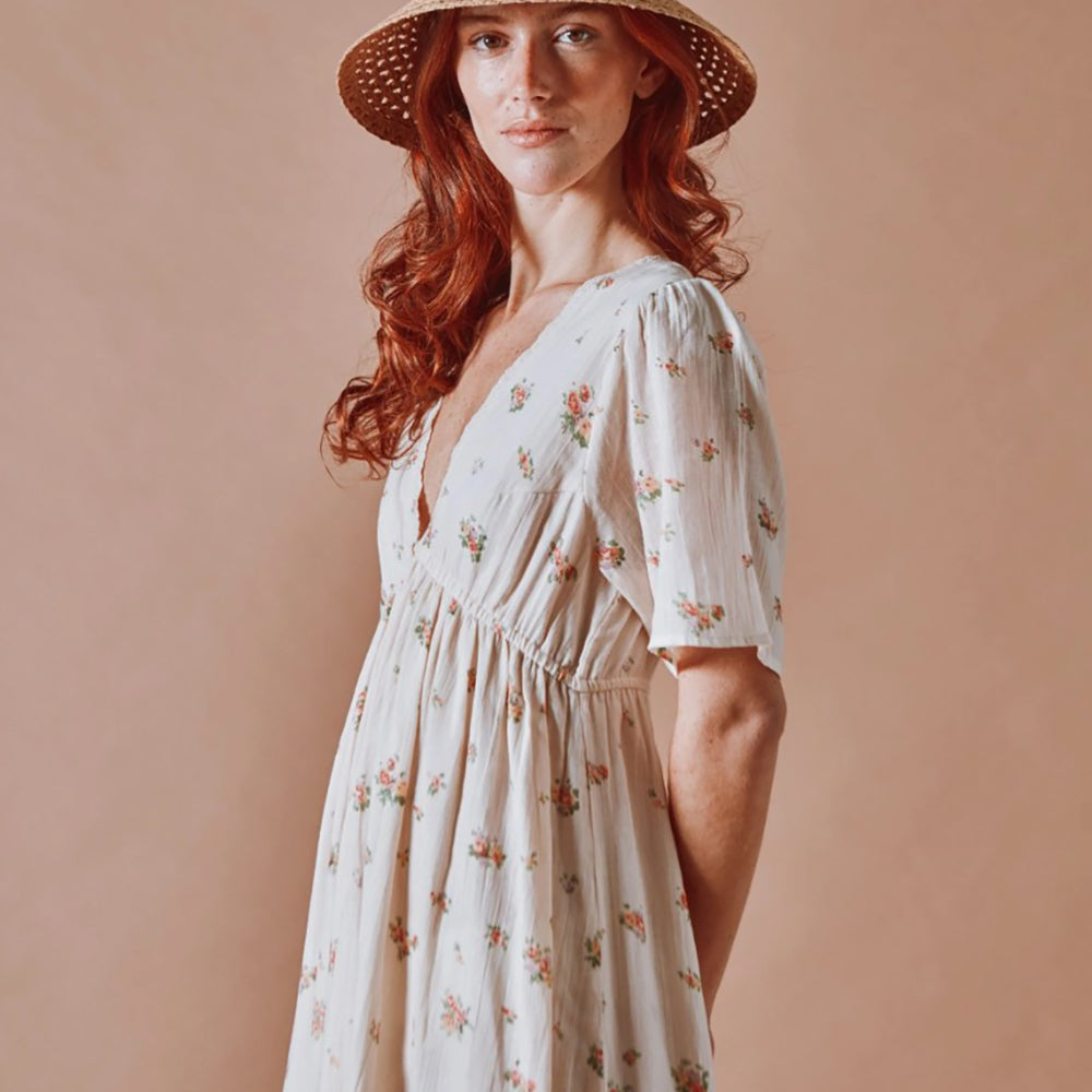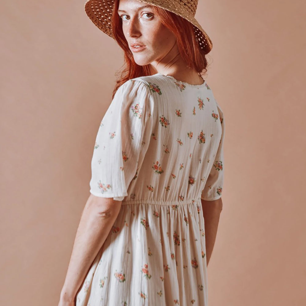 Langes Kleid von Emile & Ida aus ecrufarbenem Bio-Baumwollvoile, verziert mit unzähligen bunten Blumen. Der geraffte Rock sitzt an einem elastischen Bund, der sich sanft zwischen Brust und Taille hebt und diese betont.