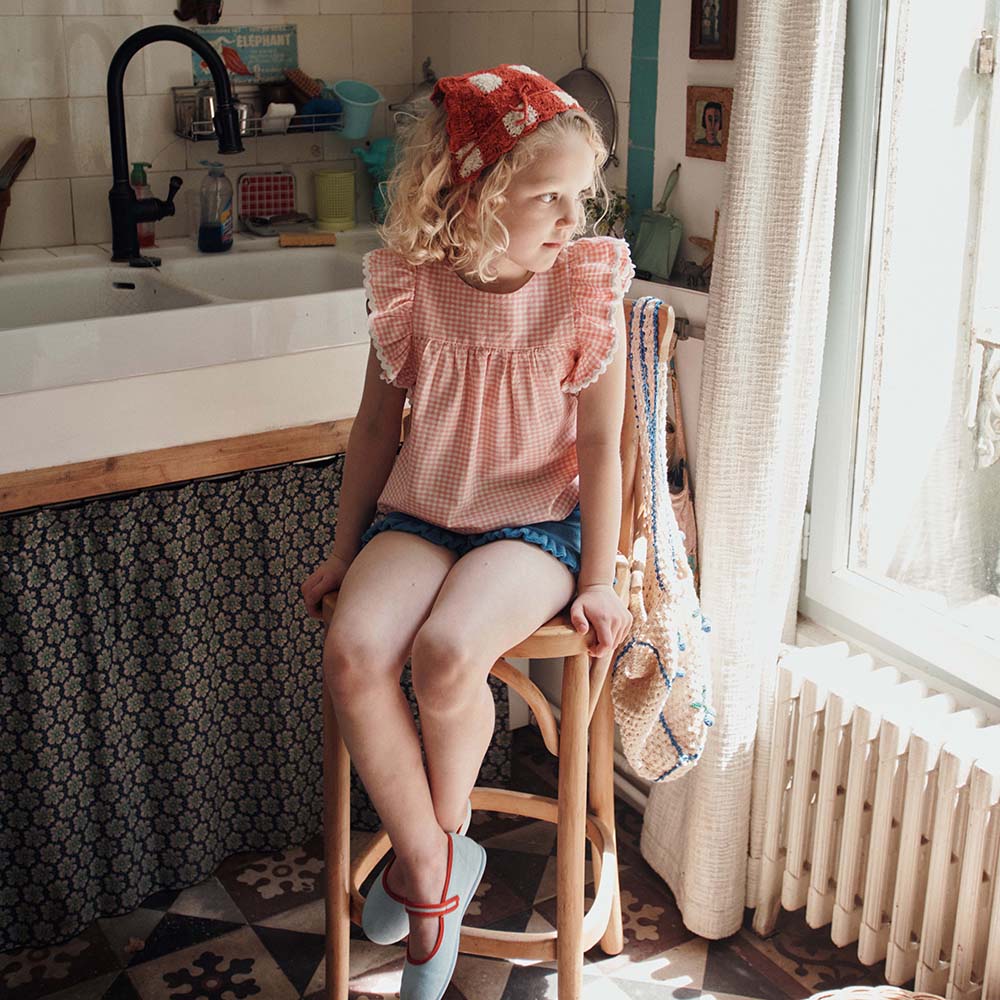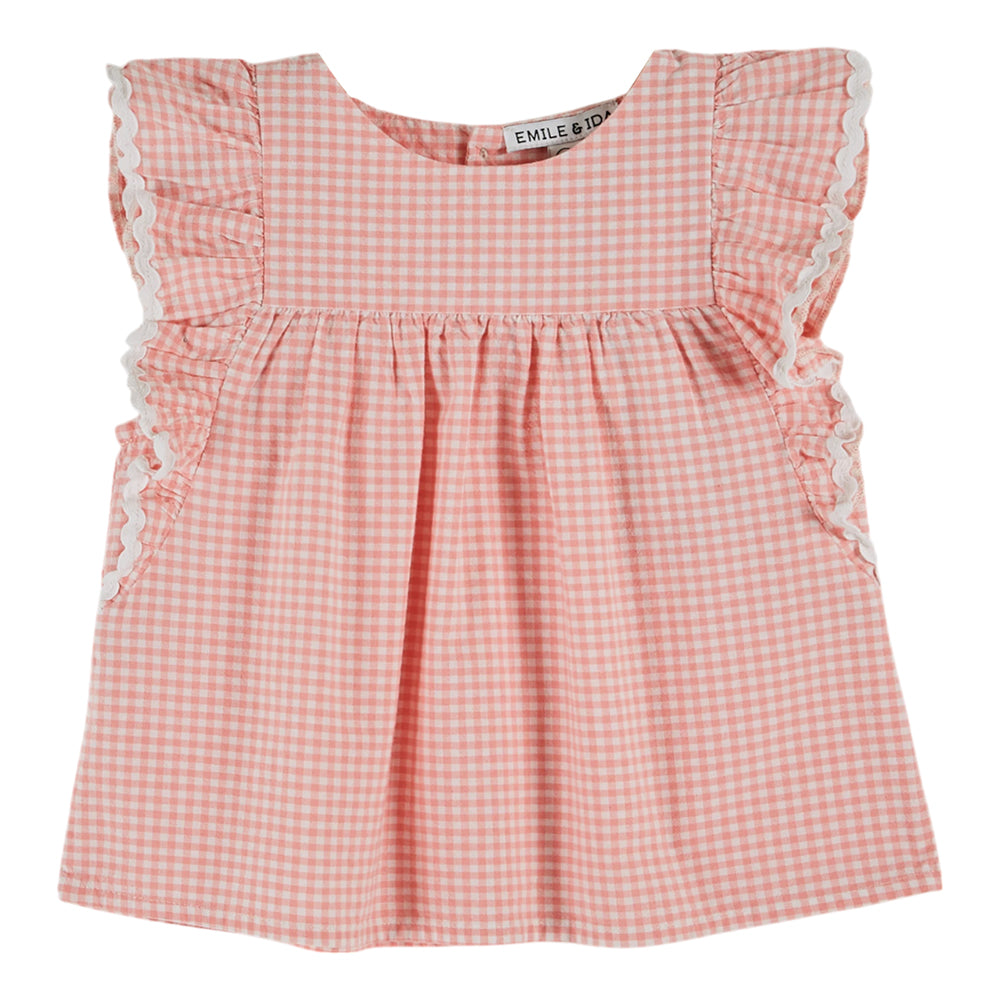 Bluse aus Bio-Baumwolle von Emile & Ida mit Vichy-Karo in kleinen rosa- und ecrufarbenen Karos, perfekt für einen Urlaub oder anderswo.