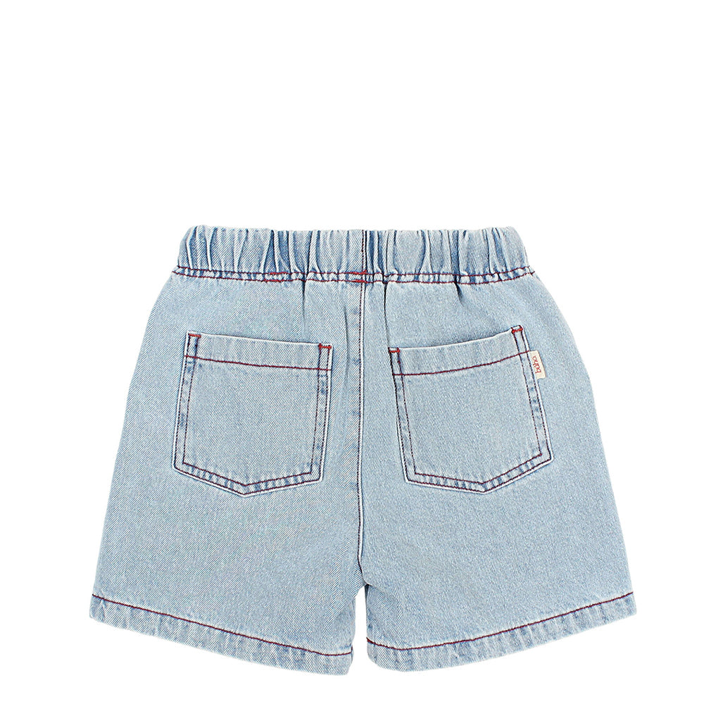Coole Jeansbermuda von Buho mit elastischem Bund und Kordelzug aus Rohbaumwolle für optimalen Sitz. Vordertaschen und aufgesetzte Gesässtaschen. Kontrastnähte und Ziernähte.