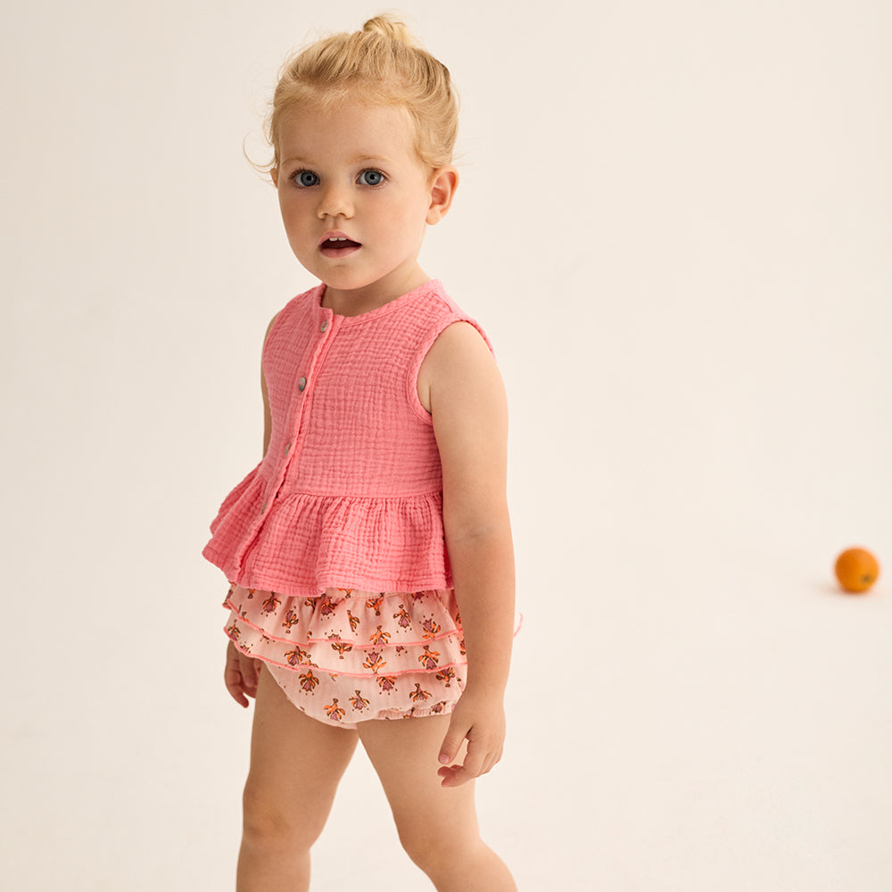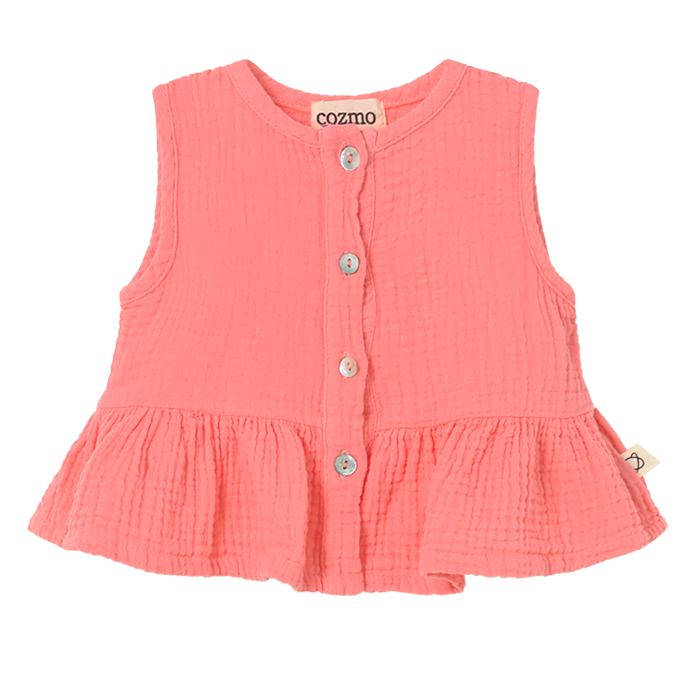 Oberteil aus Baumwollgaze von Cozmo für Babys und Kleinkinder. Es hat einen runden Halsausschnitt, ist ärmellos, hat eine Knopfleiste vorne und eine geraffte Naht über einem ausgestellten Schösschen für einen charmanten, verspielten Look.