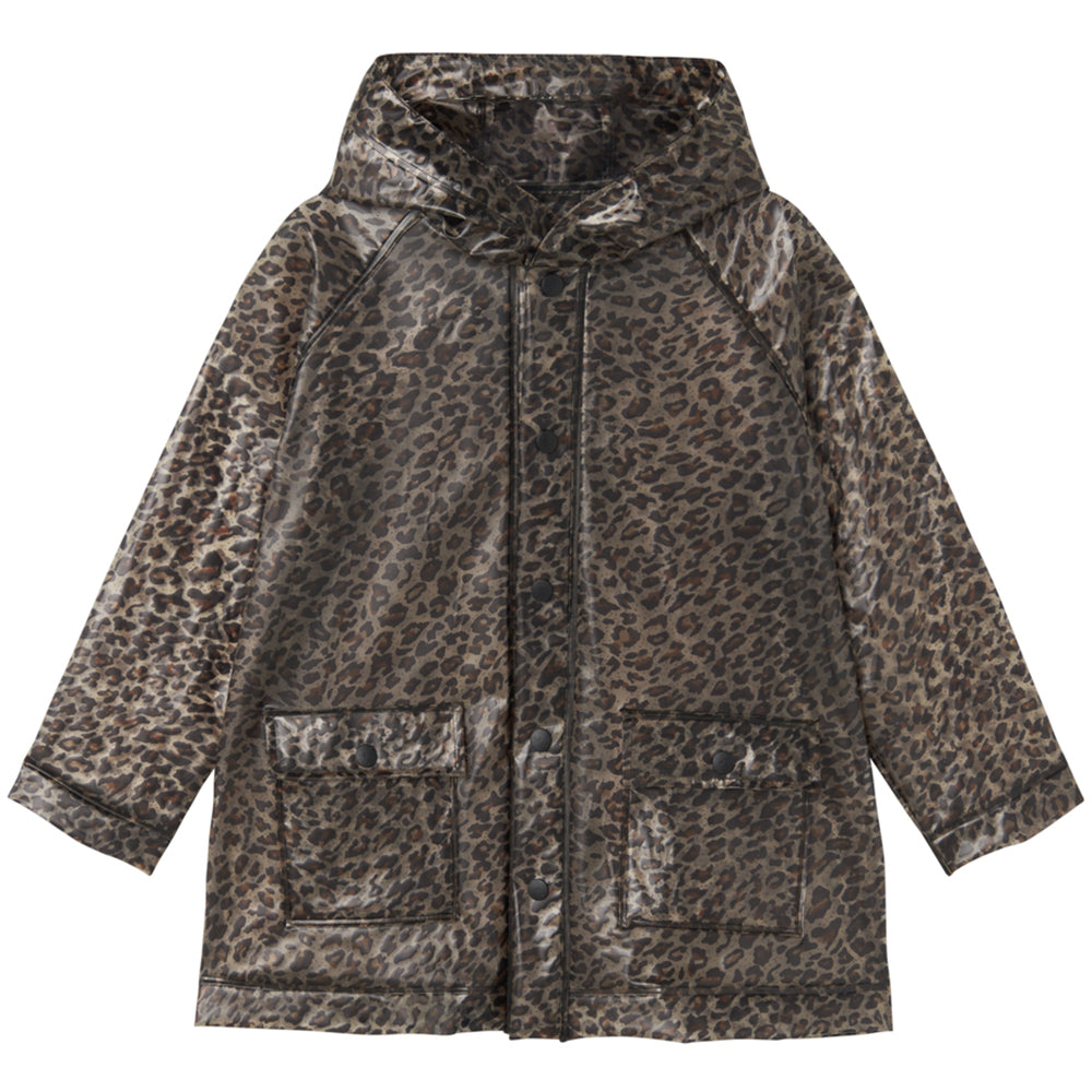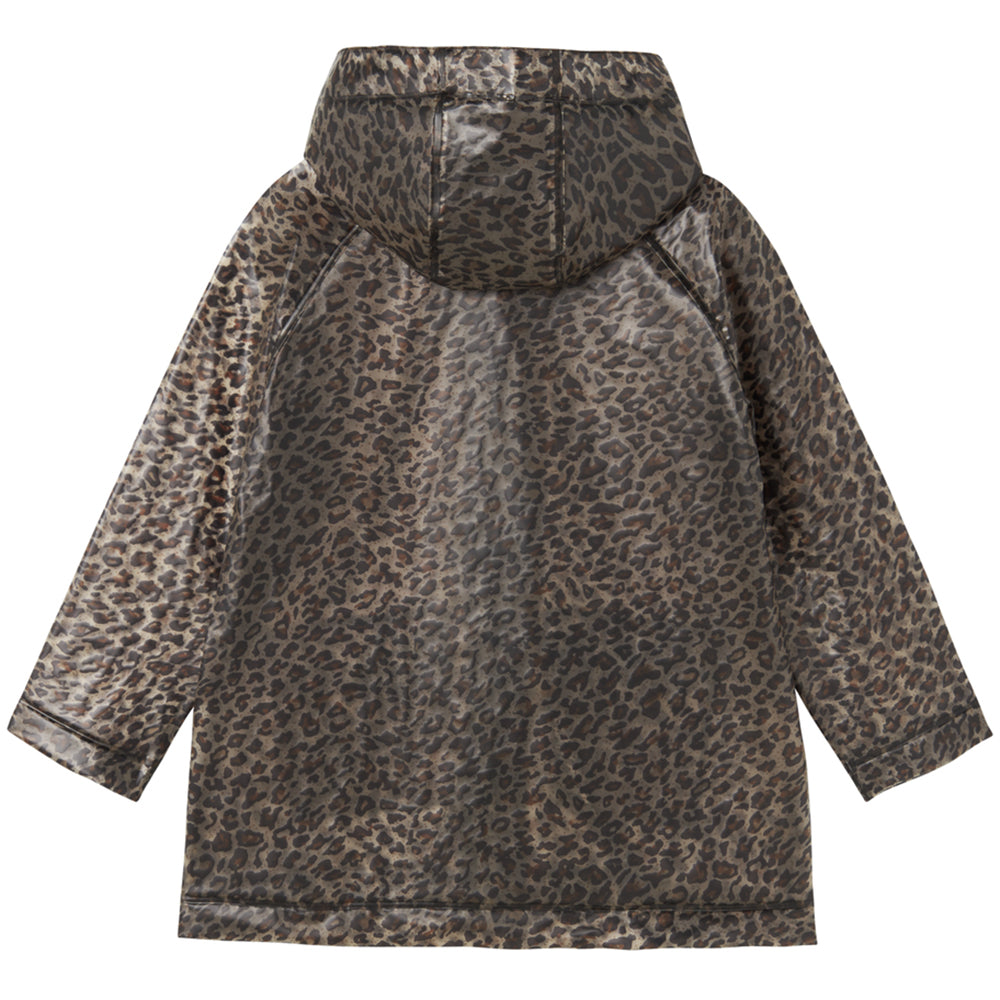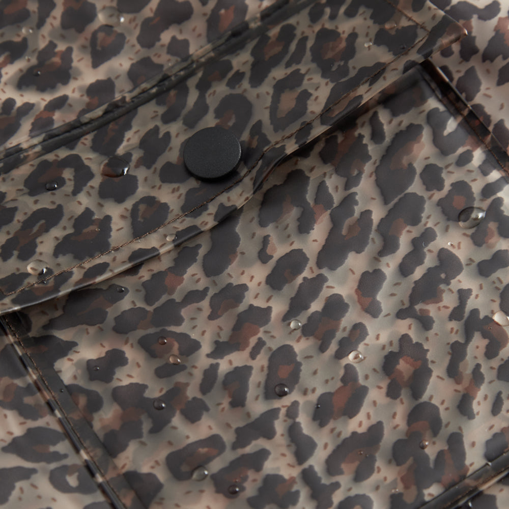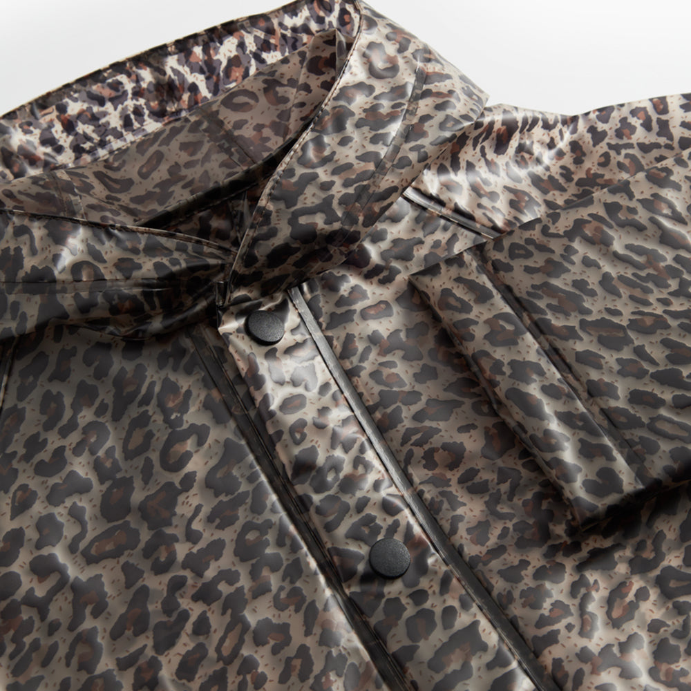 Transparente Regenjacke von MarMar Copenhagen im Leopardenmuster mit Kapuze, Druckknopfverschluss und zwei grossen Vordertaschen. Die Regenjacke ist wasserdicht und hat eine Wassersäule von 10.000 mm.