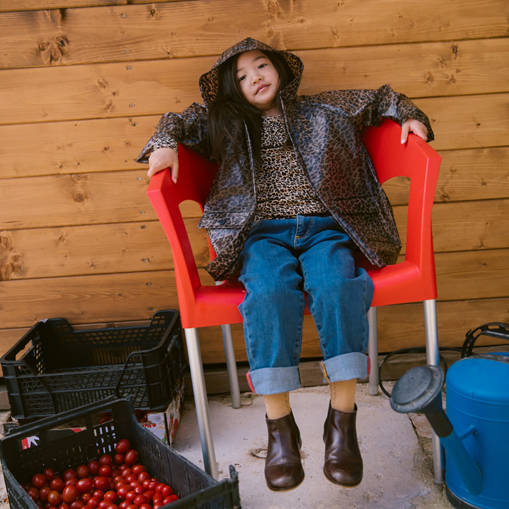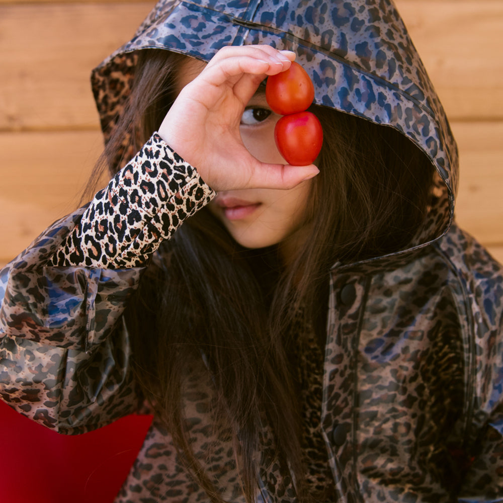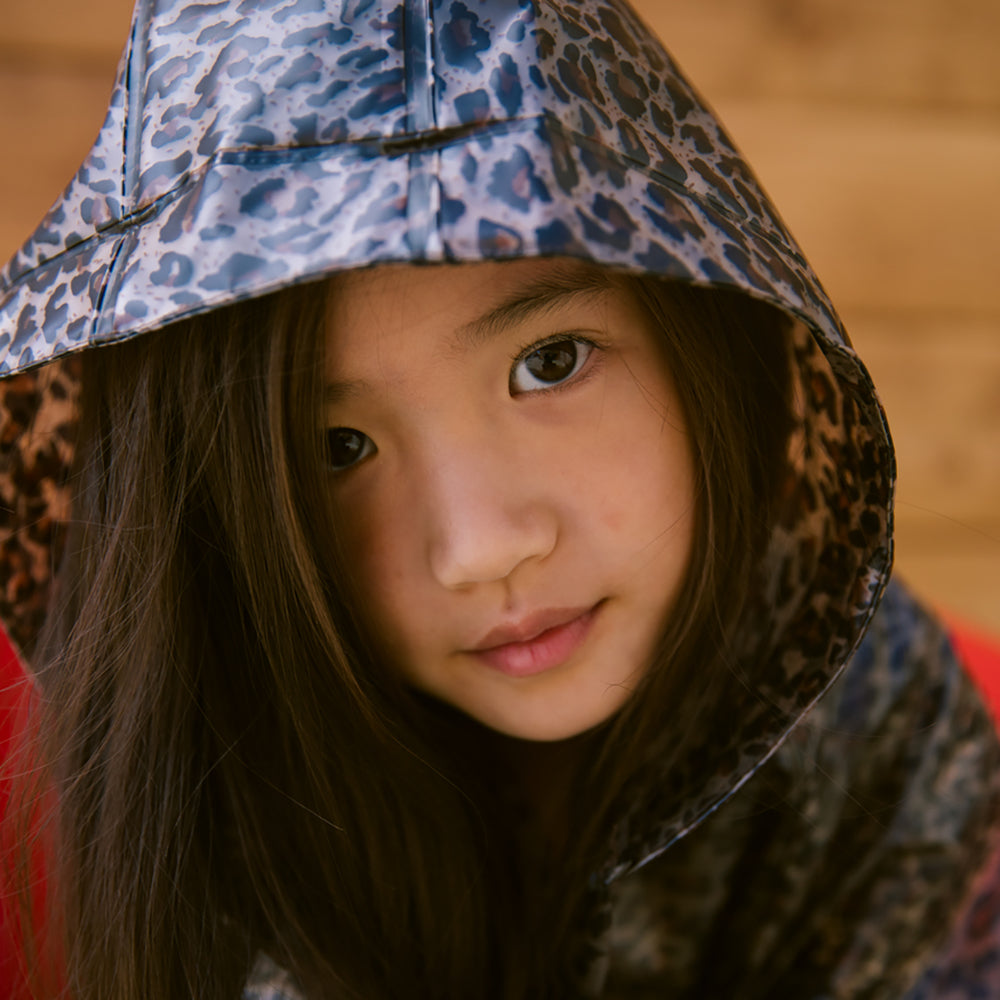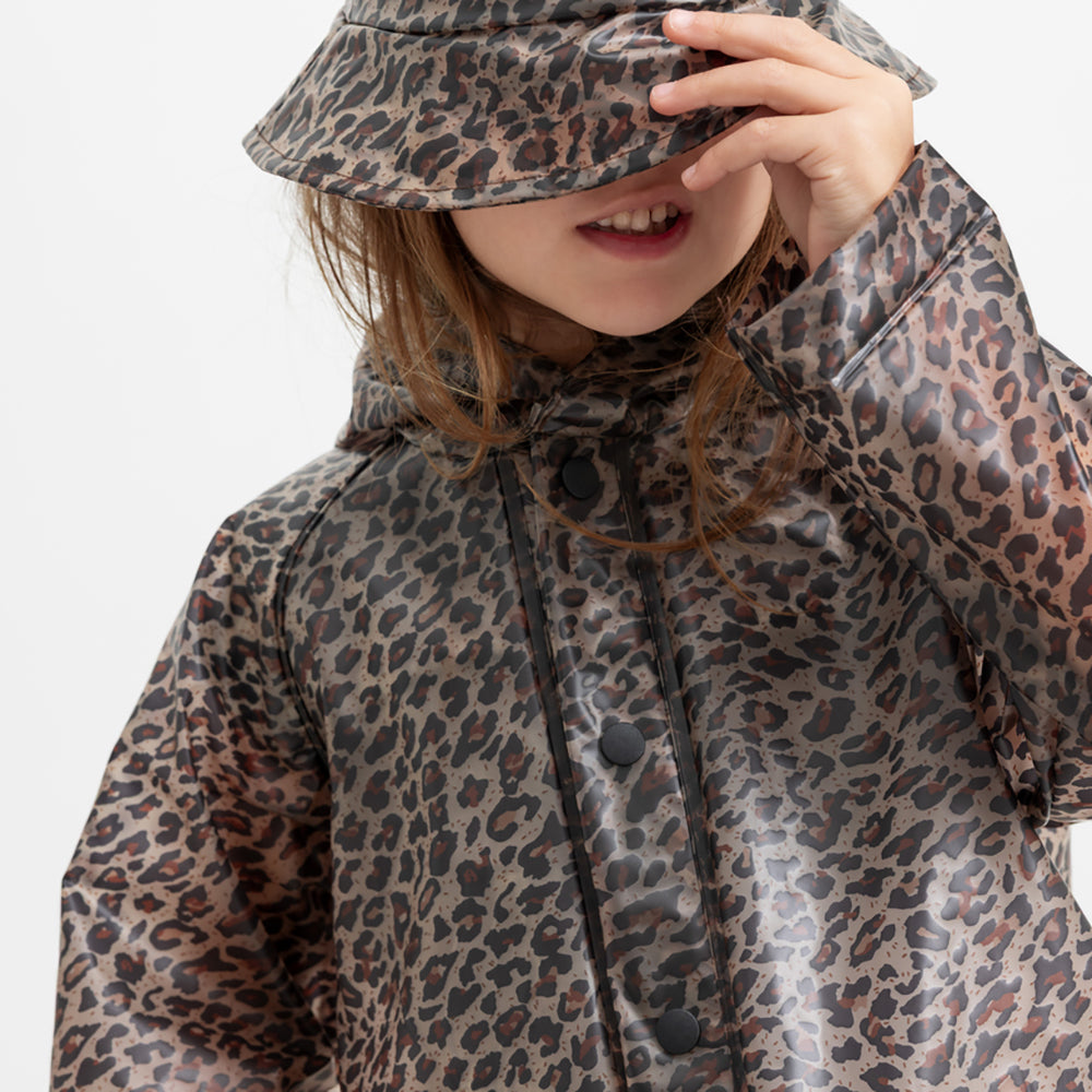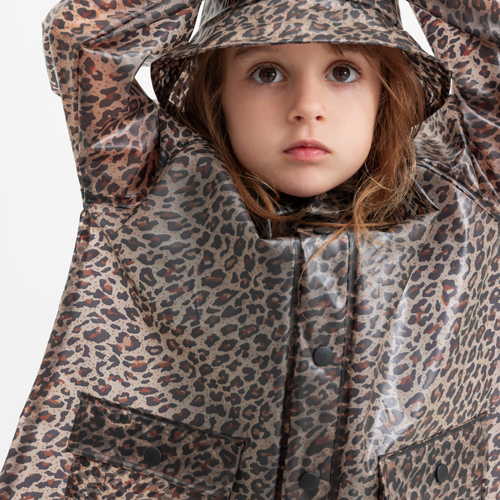 Transparente Regenjacke von MarMar Copenhagen im Leopardenmuster mit Kapuze, Druckknopfverschluss und zwei grossen Vordertaschen. Die Regenjacke ist wasserdicht und hat eine Wassersäule von 10.000 mm.