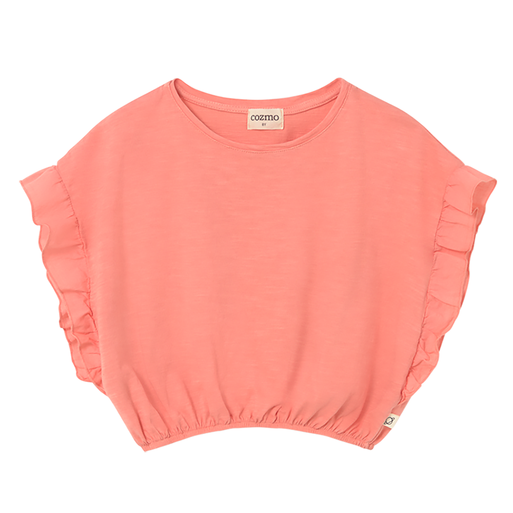 Mädchen-T-Shirt von Cozmo aus sehr leichtem, meliertem Baumwollstoff. Es hat einen Rundhalsausschnitt, überschnittene Schultern mit flatternden Ärmeln aus Baumwollvoile und einen elastischen Saum für eine bequeme Passform.