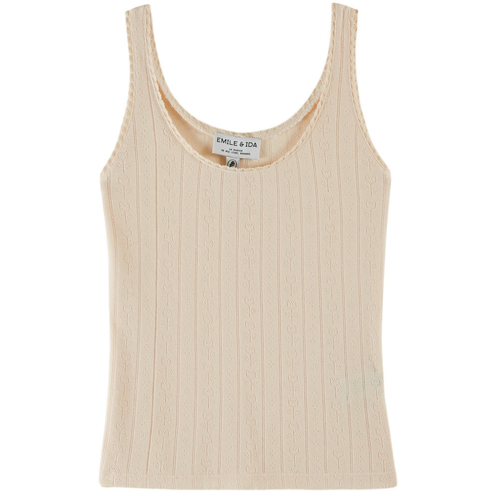 Tanktop von Emile & Ida aus cremefarbenem Baumwoll-Modal-Jersey. Das Design besticht durch seine strukturierte Strickart und das subtile Zusammenspiel von rechten und linken Maschen, wodurch ein florales Muster entsteht, das dem Kleidungsstück Tiefe und Charakter verleiht.