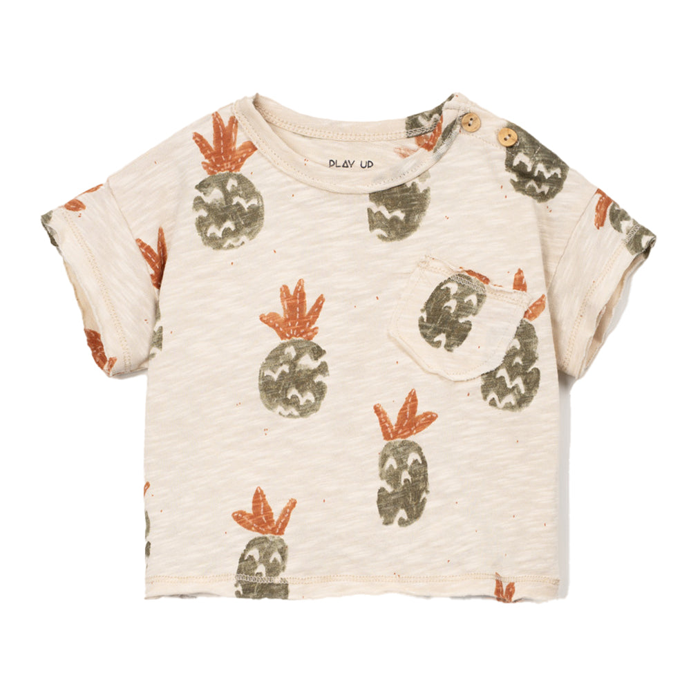 Dieses T-Shirt von PLAY UP aus Bio-Baumwolljersey hat kurze Ärmel, einen Rundhalsausschnitt, Schulteröffnungen mit Kokosnussknöpfen, eine aufgesetzte Brusttasche und einen coolen Ananas-Print.