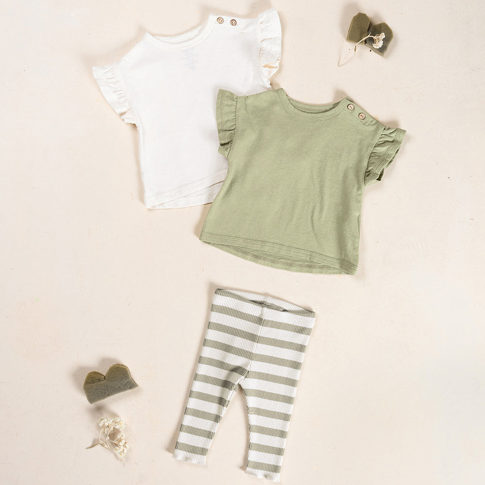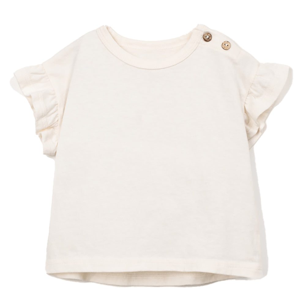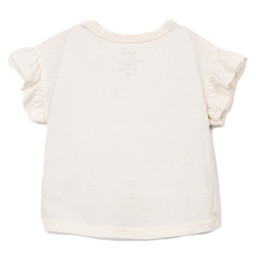 Dieses T-Shirt von PLAY UP ist aus Jersey-Stoff gefertigt, einer Mischung aus Bio-Baumwolle und recycelter Baumwolle. Es hat kurze, geraffte Ärmel, einen Rundhalsausschnitt und eine Schulteröffnung mit Kokosnussknöpfen.